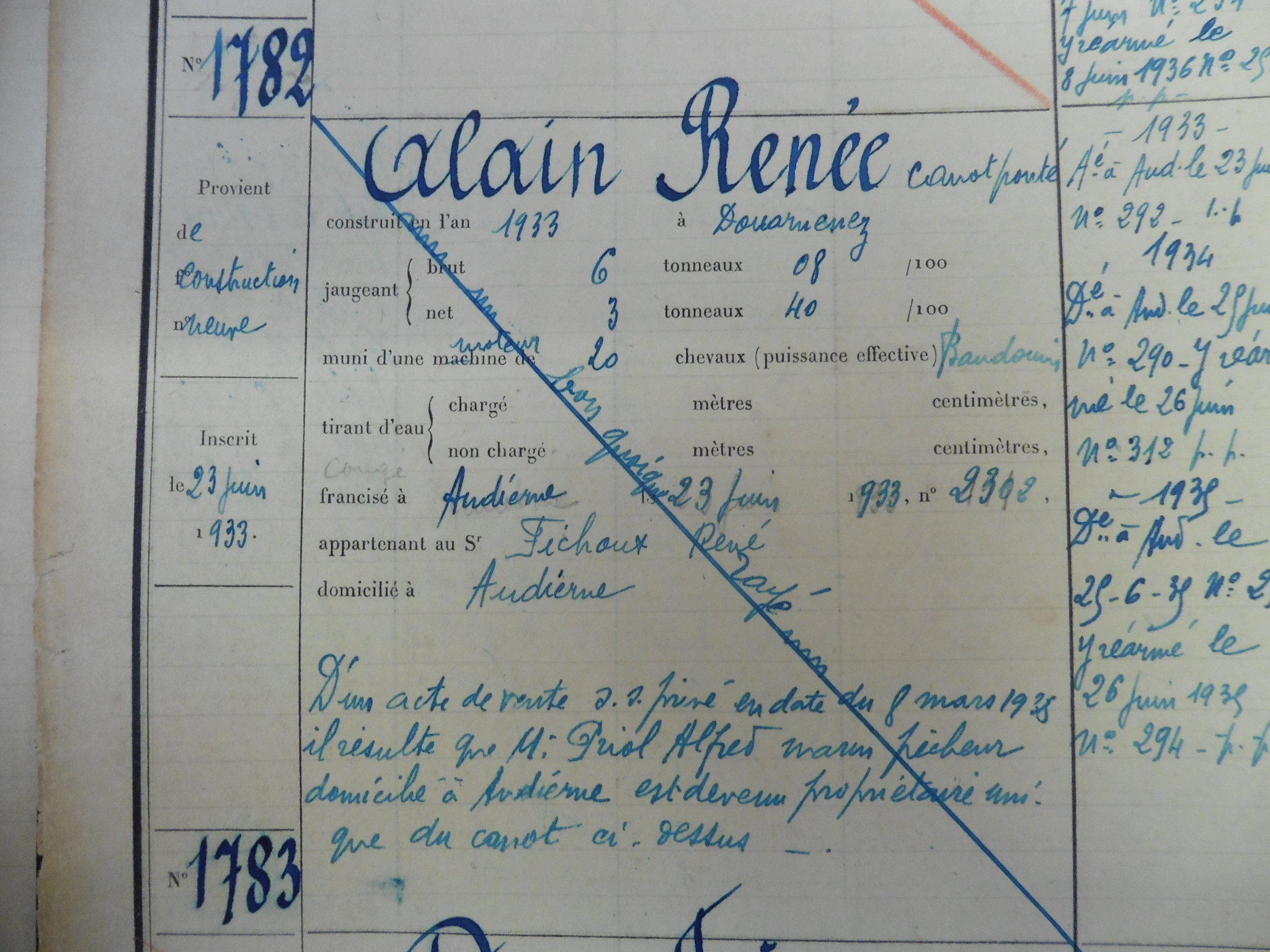 Ce bateau est inscrit AD à l'origine (Au1783), construit pour René FICHOUX. Ce marin passe son navire à DZ en 1936 (DZ3284), puis le vend à Alfred PRIOL en 1938, qui repasse le bateau à Audierne sous son n° d'origine (Au1783).