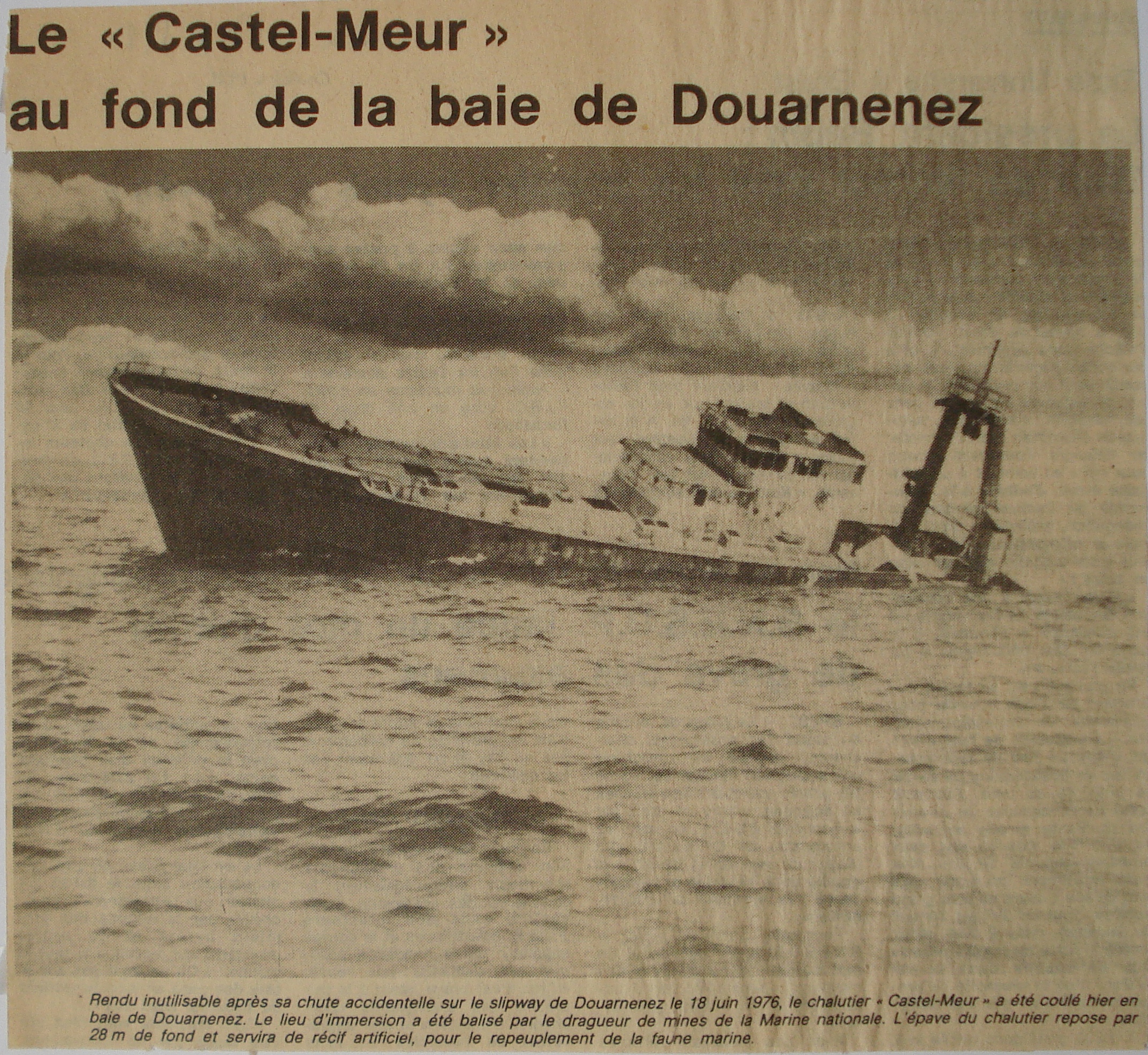 Après renversement sur le slipway de Douarnenez, le Castel Meur est resté 8 ans au mouillage du Rosmeur, avant d'être coulé, le 17 mai 1984, au milieu de la baie (Latitude : 48°9,24' N - Longitude : 4°24,65' W) comme refuge à poissons, par 32 mètres de fond.