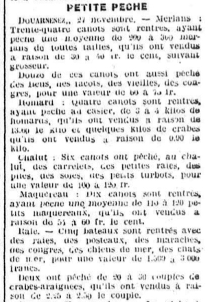 Journal L'Ouest-Eclair Date 29 November 1925 Mots-clés Merlan, Homard, Chalut, Maquereau, Raie, Araignée, Prix, Mercuriale Lieu(x) Douarnenez Contributeur(s) Michel Le Berre Image