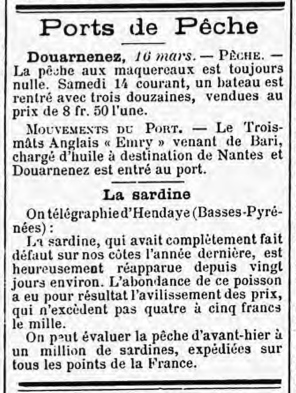 Journal L'Etoile de la mer Date 17 March 1896 Autres bateaux Emry Mots-clés Pêche, Prix, Maquereau, Sardine Lieu(x) Douarnenez, Hendaye Contributeur(s) Michel Le Berre Image
