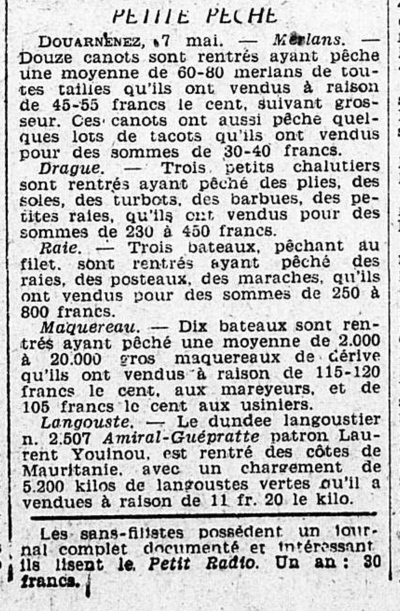 Journal L'Ouest-Eclair Date 09 May 1929 Bateau(x) AMIRAL GUÉPRATTE - DZ2507 Dundee - 1923-1930 Mots-clés Retour de pêche, Langouste verte, Prix, Raie, Maquereau, Merlan, Drague Lieu(x) Douarnenez, Mauritanie Personnes Laurent Youinou Contributeur(s) Henri Youinou Image