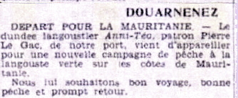 Journal La Dépêche du Finistère Date 07 March 1936 Bateau(x) ANNI TEO - DZ3151 Dundee mauritanien - 1934-1955 Mots-clés Départ campagne, Langouste verte Lieu(x) Douarnenez, Mauritanie Personnes Pierre Le Gac Contributeur(s) Jacques Join Image