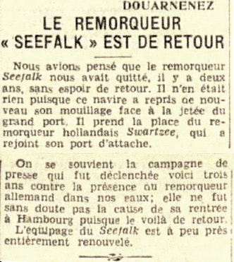 Journal La Dépêche du Finistère Date 16 September 1936 Autres bateaux Seefalk, Swartzee Mots-clés Remorqueur, Assistance, Sauvetage Lieu(x) Douarnenez Contributeur(s) Jacques Join Image