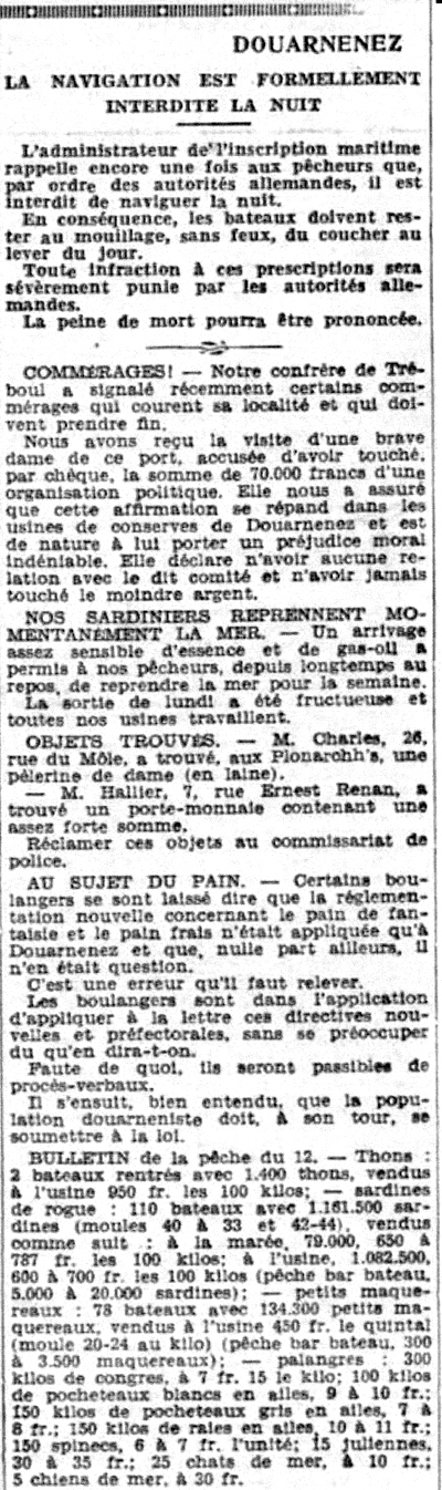 Journal La Dépêche du Finistère Date 15 August 1940 Mots-clés Interdiction, Nuit, Carburant, Sardine, Prix, Quantité, Thon, Maquereau, Palangres Lieu(x) Douarnenez Contributeur(s) Jacques Join Image