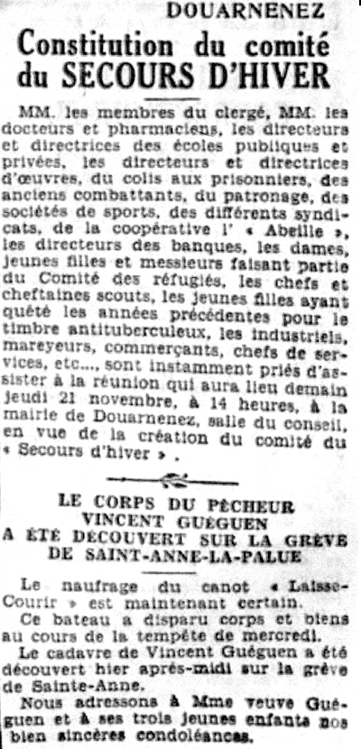 Journal La Dépêche du Finistère Date 20 November 1940 Bateau(x) LAISSE COURIR - DZ2790 Canot - 1926-1940 Mots-clés Réunion, Comité, Secours, Hiver, Péri en mer, Corps Lieu(x) Douarnenez, Sainte-Anne-la-Palud Personnes Vincent Guéguen Contributeur(s) Jacques Join Image
