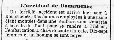 Journal La Presse Date 21 November 1883 Mots-clés Tempête, Chaloupe, Passeur, Lame, Chavirement, Victimes, Mascaret, Chavirage, Lundi noir Lieu(x) Douarnenez, Le Guet, Tréboul Personnes Quéinnec Contributeur(s) Michel Le Berre Image