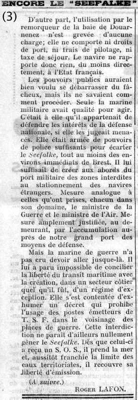 Journal Le Petit Douarneniste Date 29 January 1933 Autres bateaux Seefalke Mots-clés Remorqueur, Assistance, Sauvetage, Allemand, Polémique Lieu(x) Douarnenez Contributeur(s) Michel Le Berre Image