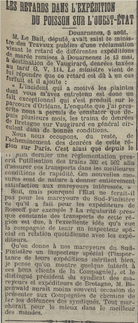 Journal La Dépêche de Brest. Principal Date 06 August 1912 Mots-clés Député, Réclamation, Expédition, Poisson, Pavillon de la marée, Halles, Plaintes, Ministre des Travaux publics, Incident, Enquête, Syndicat, Mareyeurs, Doléances, Transport, Train, Retard Lieu(x) Douarnenez, Vaugirard, Orléans, Bretagne, Paris, Finistère, Roscoff Personnes MM. Le Bail, Bigenwald Contributeur(s) Jacques Join Image