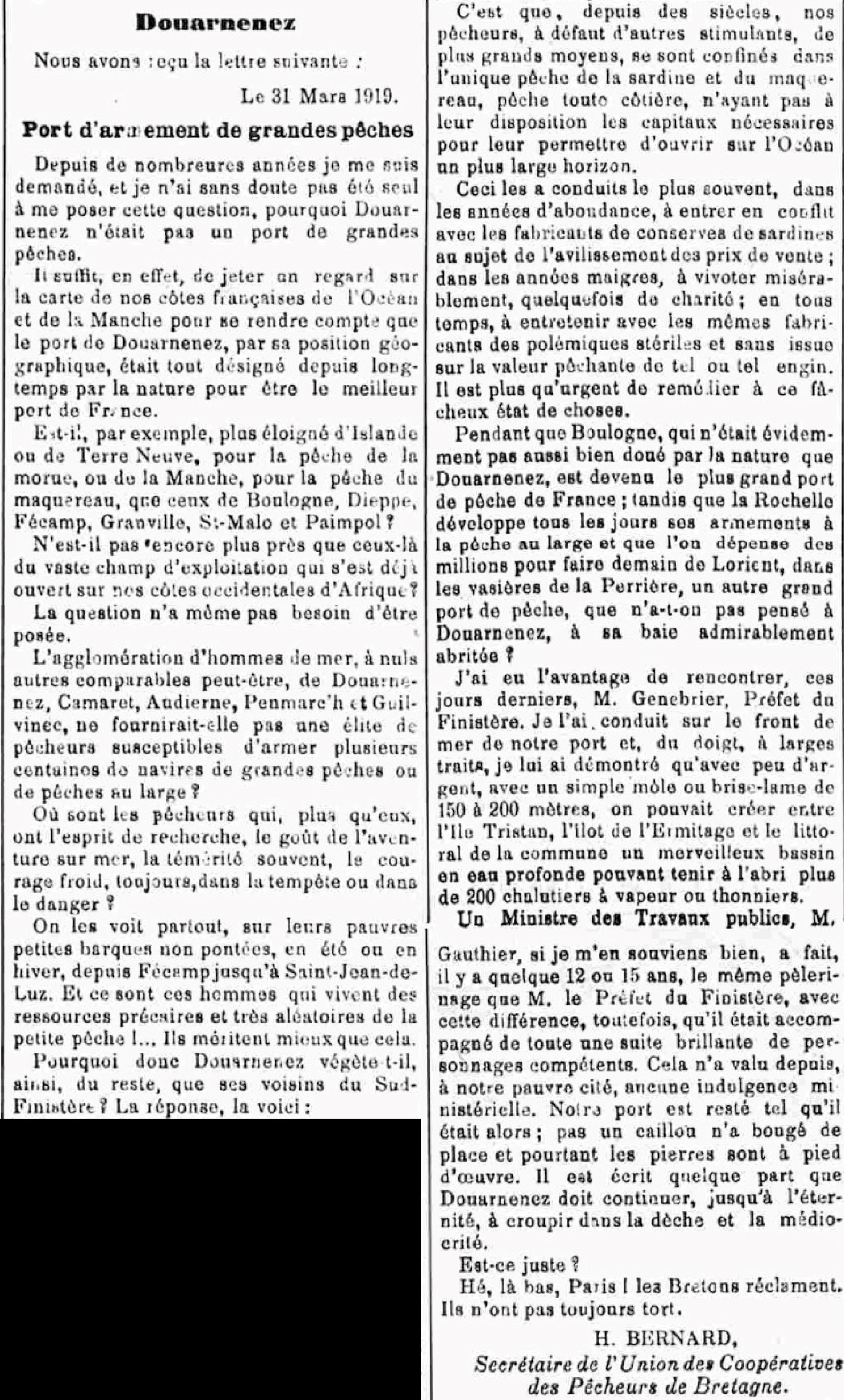 Lettre, Secrétaire, Union coopérative, Pêcheurs bretons, Morue, Maquereau, Armement, Pêche au large, Manque, Capitaux, Conflit, Fabricants, Conserves, Avilissement, Prix, Misère, Charité, Baie, Abri, Rencontre, Préfet, Construction, Môle, Brise-lame, Bassin en eau profonde, Chalutier à vapeur, Thonier, Ministère des Travaux publics, Réclamation