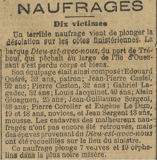 patron Edouard Quéré, matelots Jean-Pierre Castel, Pierre Celton, Gabriel Lagadec, Louis Jacquinet, Alain Gloaguen et Jean-Guillaume Sergent, novices Pierre Coroller et Eugène Le Dem, mousse Jean Sergent