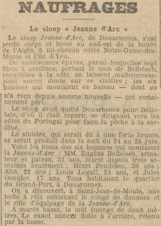 patron Eugène Belbéoch, matelots Henri Pendézec, Alain, Louis Le Gall, novice Jules Gonidec