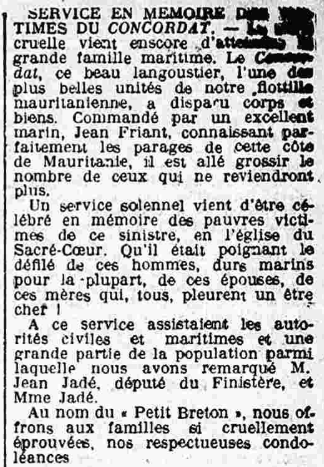 Journal Le Petit Breton Date 15 April 1928 Bateau(x) CONCORDA - DZ2373 Dundee langoustier - 1922-1927 Mots-clés Dundée, Langoustier mauritanien, Perdu corps et biens, Victimes, Cérémonie religieuse, Église, Sacré-Coeur, Autorités maritimes, Population, Familles, Condoléances Lieu(x) Douarnenez, Mauritanie Personnes patron Jean Friant, M. et Mme Jean Jadé Contributeur(s) Jacques Join Image