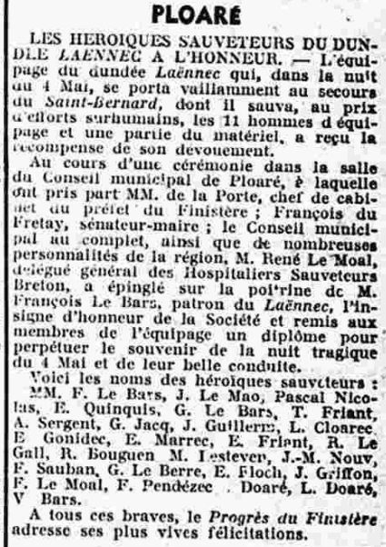 MM. de la Porte, François du Frétay, René Le Moal, François Le Bars, J. Le Mao, Pascal Nicolas, E. Quinquis, G. Le Bars, T. Friant, A. Sergent, G. Jacq, J. Guillerm, L. Cloarec, E. Gonidec, E. Marrec, E. Friant, R. Le Gall, R. Bouguen, M. Lesteven, J.-M. Nouy, F. Sauban, G. Le Berre, E. Floch, J. Griffon, F. Le Moal, F. Pendézec, A. Doaré, L. Doaré, V. Bars