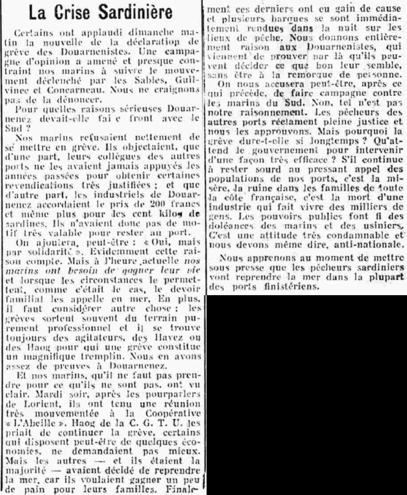 Journal Le Progrès du Finistère. Principal Date 20 July 1935 Mots-clés Crise sardinière, Déclaration, Grève, Conflit social, Solidarité, Agitation, Pourparlers, Réunion, Coopérative L'Abeille, Syndicat, Intervention, Gouvernement, Misère, Ruine, Familles, Population, Doléances Lieu(x) Douarnenez, Les Sables-d'Olonne, Guilvinec, Concarneau, Lorient, Finistère Personnes MM. Havez, Haog Contributeur(s) Jacques Join Image