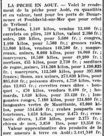 Journal Le Progrès du Finistère. Principal Date 24 September 1932 Mots-clés Bulletin de pêche, Statistiques, Quantité, Tonnage, Valeur, Prix, Rendement, Résultats Lieu(x) Douarnenez, Tréboul, Pouldavid-sur-Mer Contributeur(s) Jacques Join Image