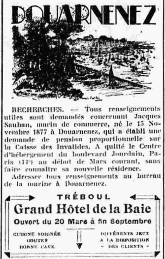Journal Le Progrès du Finistère. Principal Date 02 April 1932 Mots-clés Recherches, Renseignements, Marin de commerce, Demande, Pension, Caisse des invalides, Bureau de la marine Lieu(x) Douarnenez, Paris Personnes Jacques Sauban Contributeur(s) Jacques Join Image