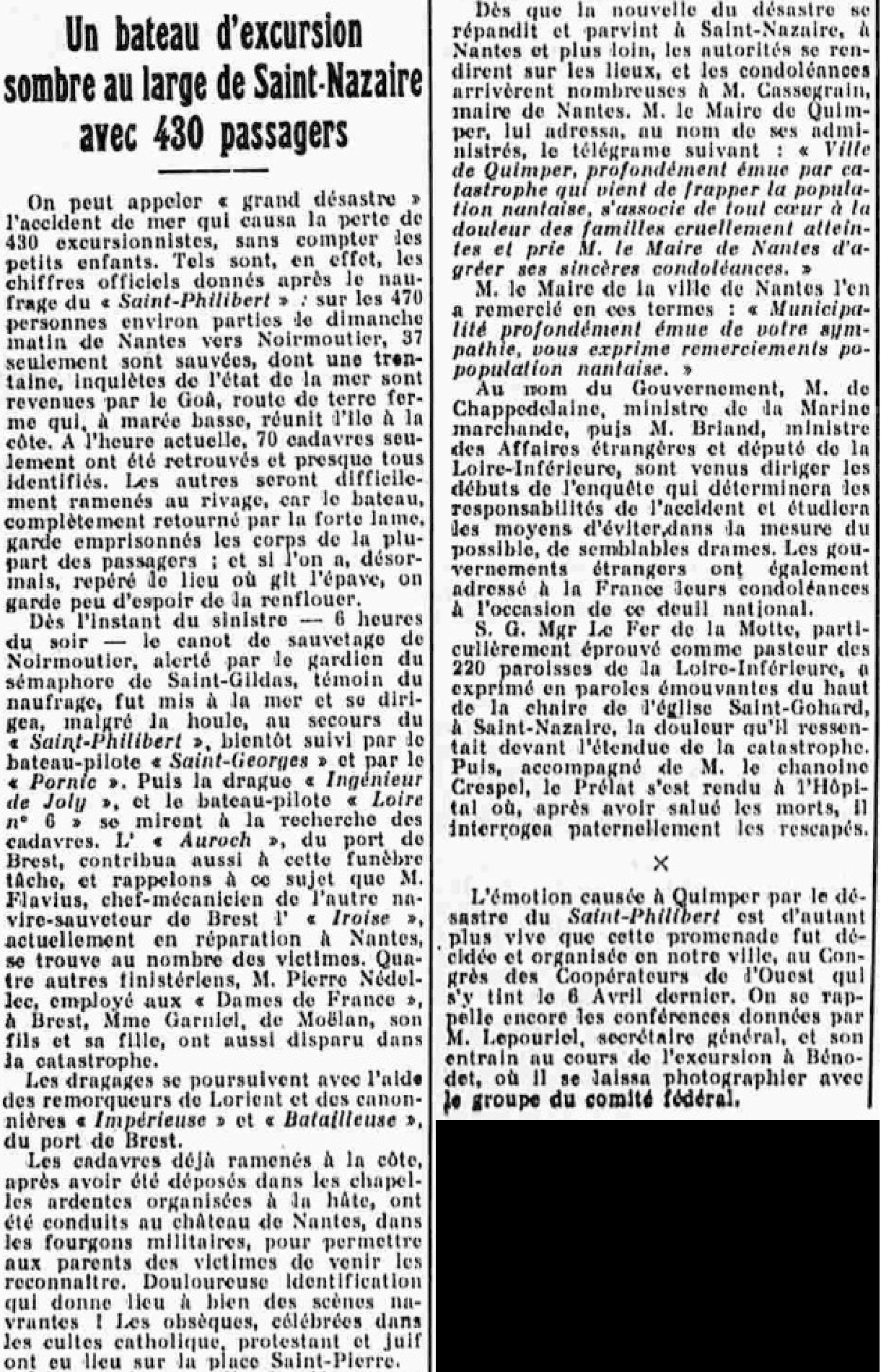 Transport de passagers, Excursion, Naufrage, Cadavres, Identification, Corps, Épave, Renflouement, Sinistre, Canot de sauvetage, Catastrophe, Dragage, Obsèques, Autorités, Condoléances, Maire, Télégramme, Familles, Ministre de la Marine marchande, Ministre des Affaires étrangères, Enquête, Responsabilité, Accident, Deuil national, Clergé, Église, Rescapés, Hôpital, Désastre