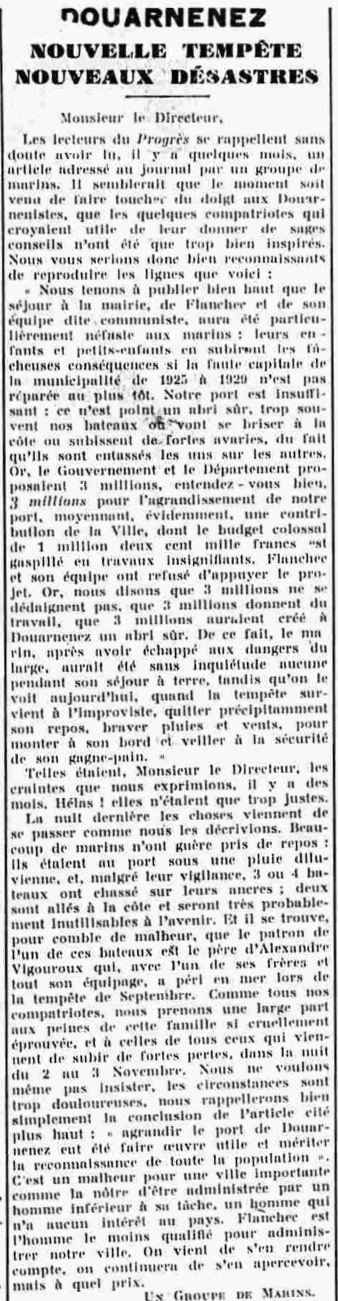 Journal Le Progrès du Finistère. Principal Date 15 November 1930 Bateau(x) GLAZ BIHEN - DZ2579 Dundee - 1924-1930 Mots-clés Tempête, Abri, Insuffisant, Avaries, Conseil général, Gouvernement, Proposition, Crédits, Travaux du port, Agrandissement, Amélioration, Refus, Maire, Conseil municipal, Chasser ancres, Faire côte, Tempête de 1930, Pertes Lieu(x) Douarnenez Personnes Daniel Le Flanchec, Alexandre Vigouroux Contributeur(s) Jacques Join Image