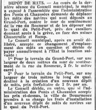 Journal Le Progrès du Finistère. Principal Date 20 November 1926 Mots-clés Séance, Conseil municipal, Maire, Administration, Ponts et Chaussées, Demande, Déplacement, Mâts, Acceptation, État, Location, Prix, Dépôt Lieu(x) Douarnenez, Grand Port, Rosmeur, Petit-Port Personnes usiniers Chancerelle et Ramp Contributeur(s) Jacques Join Image