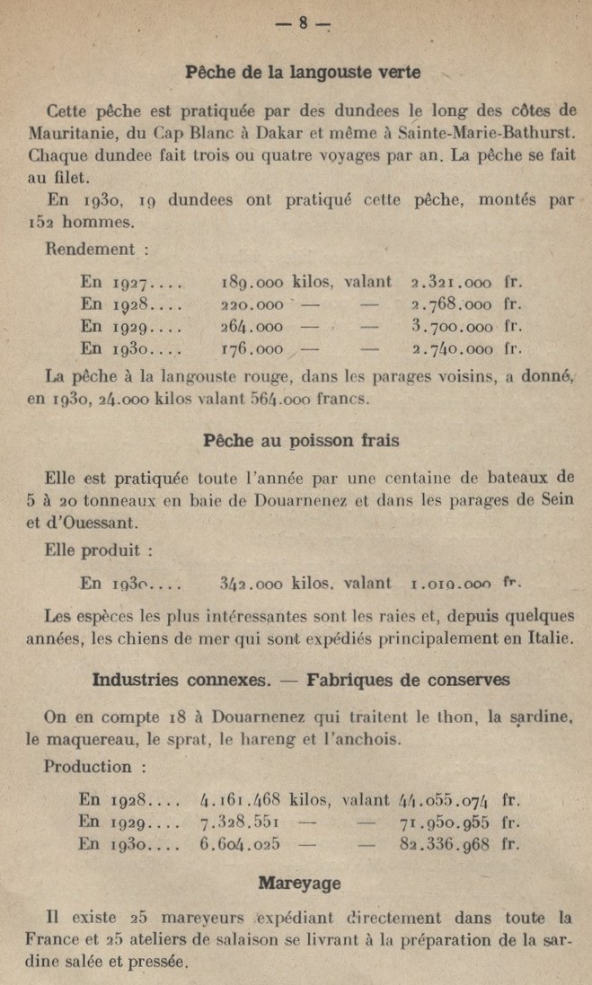 Administrateur, Inscription maritime, Rapport, Statistiques, Chiffres, Nombre, Marins-pêcheurs, Flottille, Production, Tonnage, Valeur, Industrie de la pêche, Équipement, Manutention, Môle, Quai, Déchargement, Trafic, Armement, Désarmement, Ravitaillement, Embouteillage, Caboteurs, Borneurs, Gril de carénage, Grue, Chantiers, Construction navale, Réparation, Projets, Agrandissement du port, Opposition, Refus, Crédits, Motorisation, Rendement, Sardine de rogue, Sardine de dérive, Sardine salée, Sprat, Thon, Maquereau de dérive, Maquereau de ligne, Pêche fraîche, Langouste verte, Bélugas, Dégâts, Chasse, Destruction, Tempête de 1930, Langouste rouge, Raies, Chiens de mer, Conserveries, Mareyeurs, Débouchés, Syndicats, Limitation pêche, Solidarité, Corporation, Gaspillage, Main d'œuvre, Chalutage