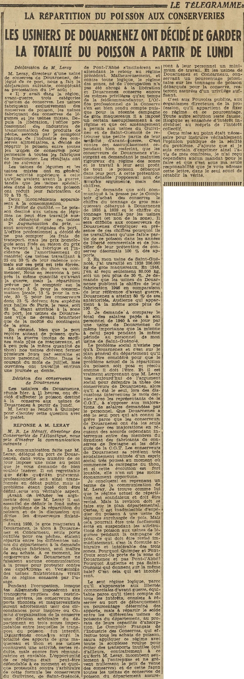 Répartition du poisson, Libération, Usinier, Déclaration, Protestation, Conserves, Fabrication, Réduction, Inconvénients, Qualité, Baisse, Prix, Augmentation, Sardine, Maquereau, Thon, Usines fermées, Chômage, Conserveurs, Décision, Discussion, Préfet, Droit de réponse, Insertion, Mise au point, Guerre, Occupation, Allemands, Restrictions, Apports, Maintien, Zones géographiques, Opposition, Chiffres, Comparaison, Refus, Salaires, Grève, Conclusion, Révision, Pouvoirs publics, Intervention, Information, Opinion publique