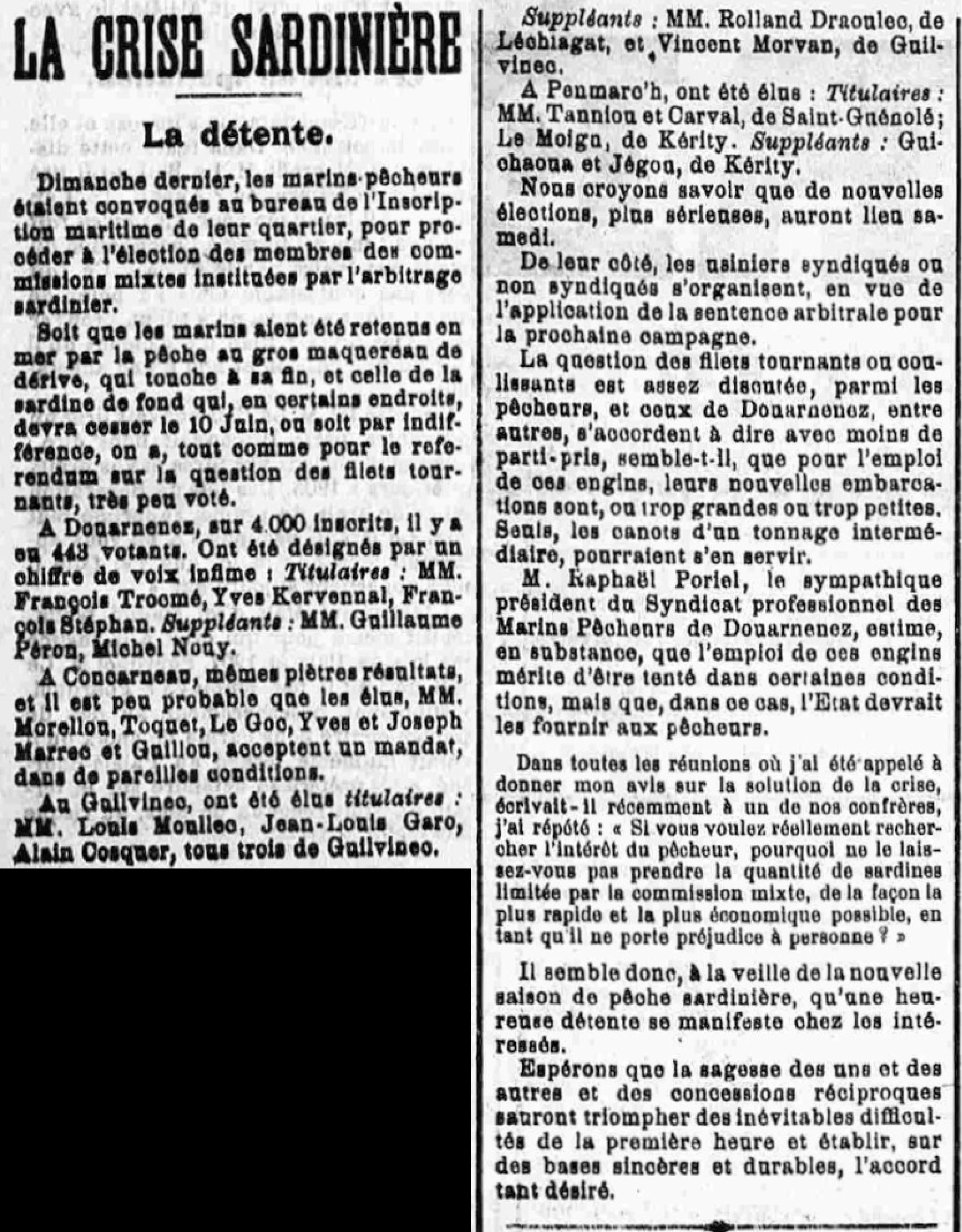 Crise sardinière, Marins-pêcheurs, Convocation, Inscription maritime, Élection, Membres, Commission mixte, Arbitrage, Vote, Usiniers, Organisation, Sentence arbitrale, Discussion, Filets tournants, Filets coulissants, Syndicat des pêcheurs, Tentative, Conditions, État, Campagne de pêche, Détente, Concessions, Accord