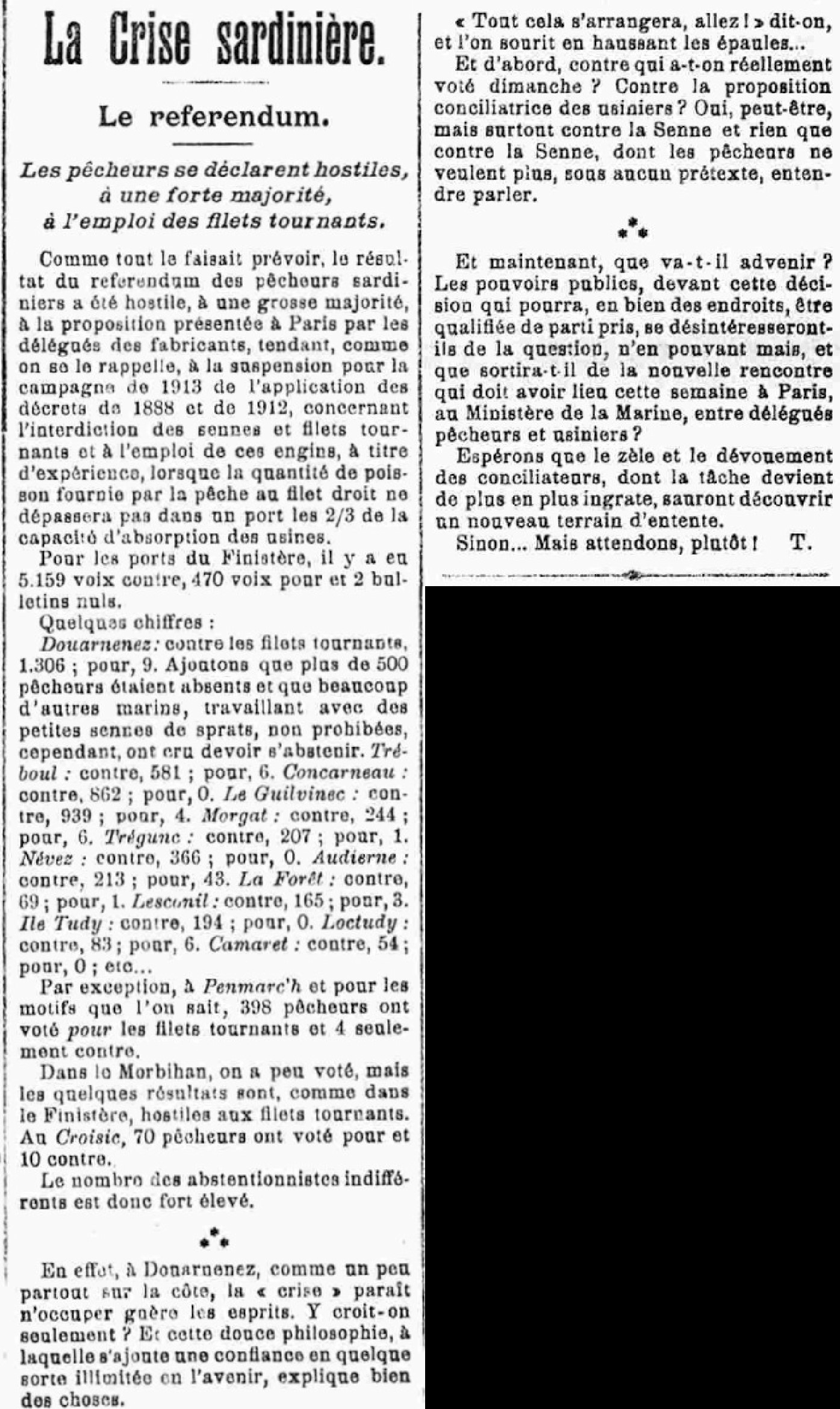 La Crise sardinière - Le referendum - Les pêcheurs se déclarent hostiles, à une forte majorité, à l'emploi des filets tournants