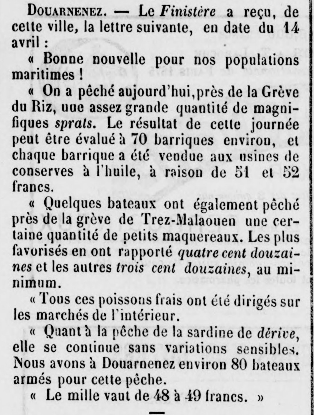 Journal L'Impartial du Finistère Date 20 April 1877 Mots-clés Bulletin de pêche, Sprats, Barriques, Quantité, Petit maquereau, Sardine de dérive, Armement, Prix, Résultats Lieu(x) Douarnenez, Plage du Ris, Trezmalaouen Contributeur(s) Jacques Join Image