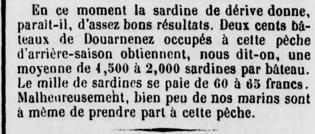 Journal L'Impartial du Finistère Date 17 December 1880 Mots-clés Bulletin de pêche, Sardine de dérive, Résultats, Quantité, Prix Lieu(x) Douarnenez Contributeur(s) Jacques Join Image