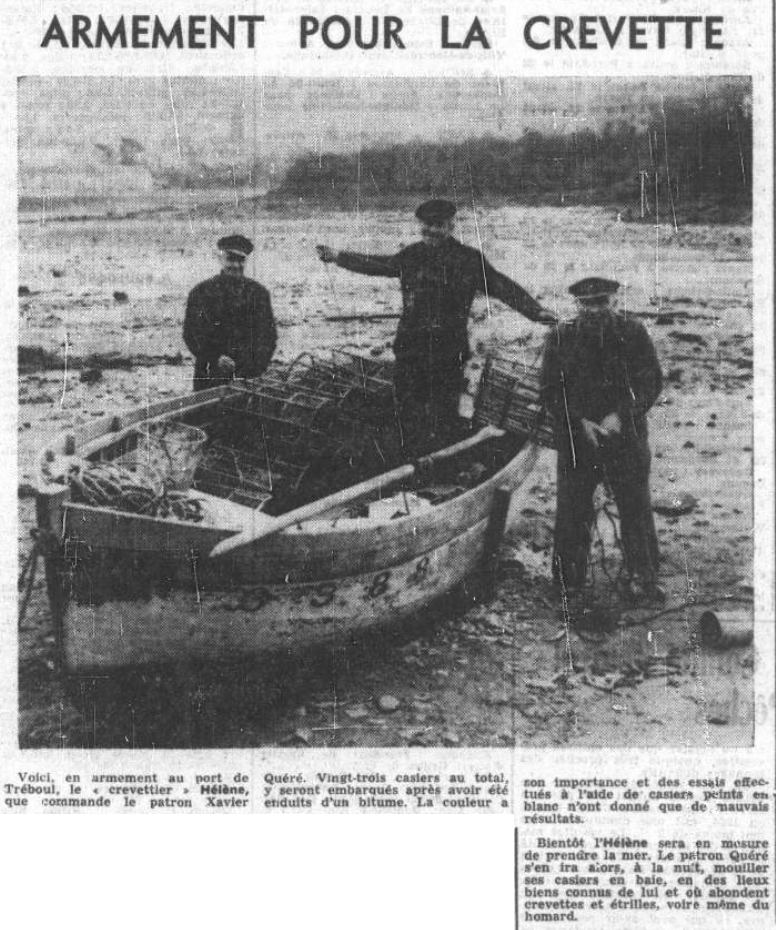 Journal Ouest-France Date 25 March 1966 Bateau(x) HELENE - DZ3885 Canot - 1954 Mots-clés Canot, Armement, Pêche à la crevette, Casiers, Peinture, Résultats, Baie, Étrilles, Homard Lieu(x) Tréboul, Baie de Douarnenez Personnes patron Xavier Quéré Contributeur(s) Emmanuel Kerloc'h Image