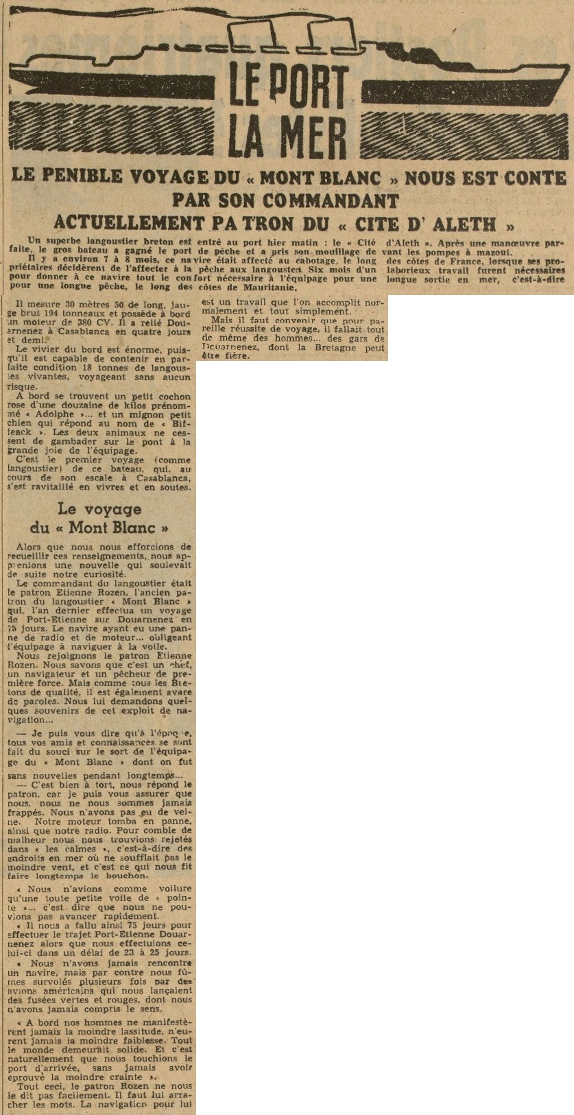 Le Port, La Mer - Le pénible voyage du "Mont Blanc" nous est conté par son commandant actuellement patron du "Cité d'Aleth"