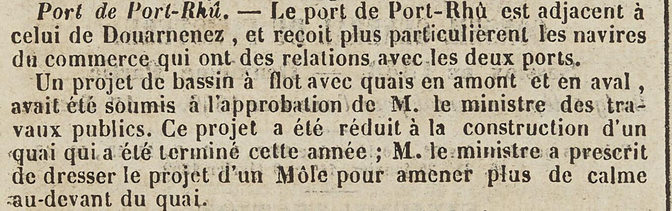 Journal L'Armoricain Date 10 February 1849 Mots-clés Conseil général, Port de commerce, Navires de commerce, Projet, Bassin à flot, Quais, Approbation, Ministre des Travaux publics, Réduction, Môle Lieu(x) Finistère, Port-Rhu, Douarnenez Contributeur(s) Jacques Join Image