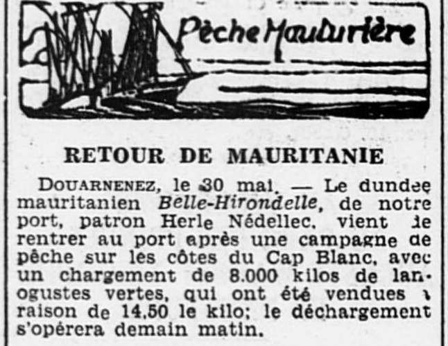 Journal L'Ouest-Eclair Date 31 May 1935 Bateau(x) BELLE HIRONDELLE - DZ3039 Dundee mauritanien - 1930-1937 Mots-clés Dundée, Langoustier mauritanien, Retour de campagne, Langoustes vertes, Déchargement Lieu(x) Douarnenez, Mauritanie, Cap Blanc (Ras Nouadhibou) Personnes patron Herlé Nédellec Contributeur(s) Jacques Join Image