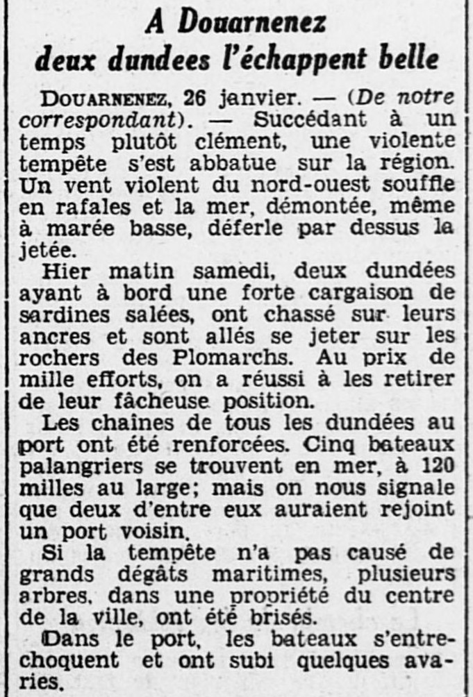 Journal L'Ouest-Eclair Date 27 January 1935 Mots-clés Tempête, Vent violent, Noroît, Dundées, Sardines salées, Chasser ancres, Faire côte, Rochers, Secours, Sauvetage, Palangriers, Abri, Refuge, Dégâts, Avaries Lieu(x) Douarnenez, Plomarc'h Contributeur(s) Jacques Join Image