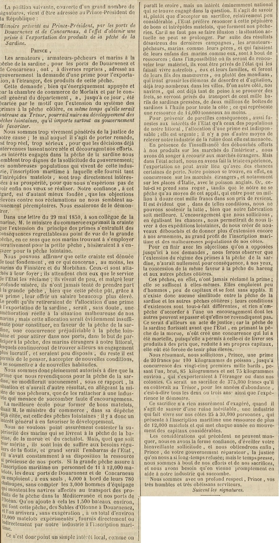Pétition, Mémoire, Président de la République, Armateurs, Pêcheurs, Demande, Prime, Exportation, Pêche à la sardine, Chambre de commerce, Conseil général, Gouvernement, Vœux, Réclamations, Ministre de la Marine, Ministre du Commerce, Allocation, Concurrence, Pêche côtière, Pêche lointaine, Revendication, Chiffres, Inscrits maritimes, Intérêt général, Conséquences, Urgence, Industrie sardinière, Menace, Ruine, Concurrence étrangère, Débouchés, Aide, État