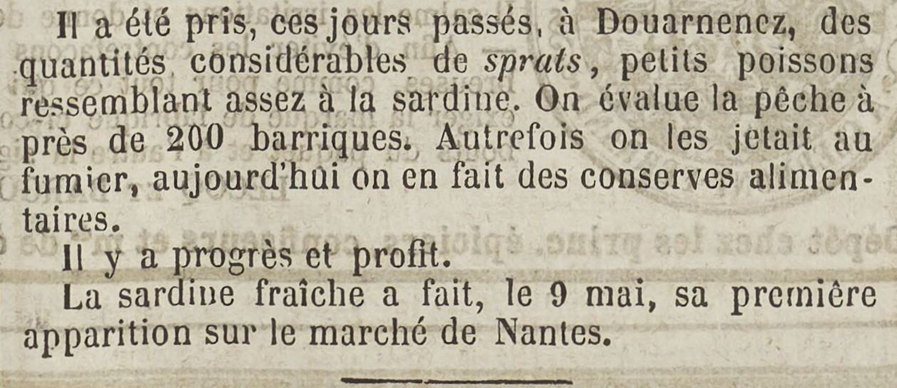Journal L'Armoricain Date 16 May 1865 Mots-clés Sprats, Pêche abondante, Barriques, Conserves, Progrès, Profits, Apparition, Sardine, Pêche fraîche Lieu(x) Douarnenez, Nantes Contributeur(s) Jacques Join Image