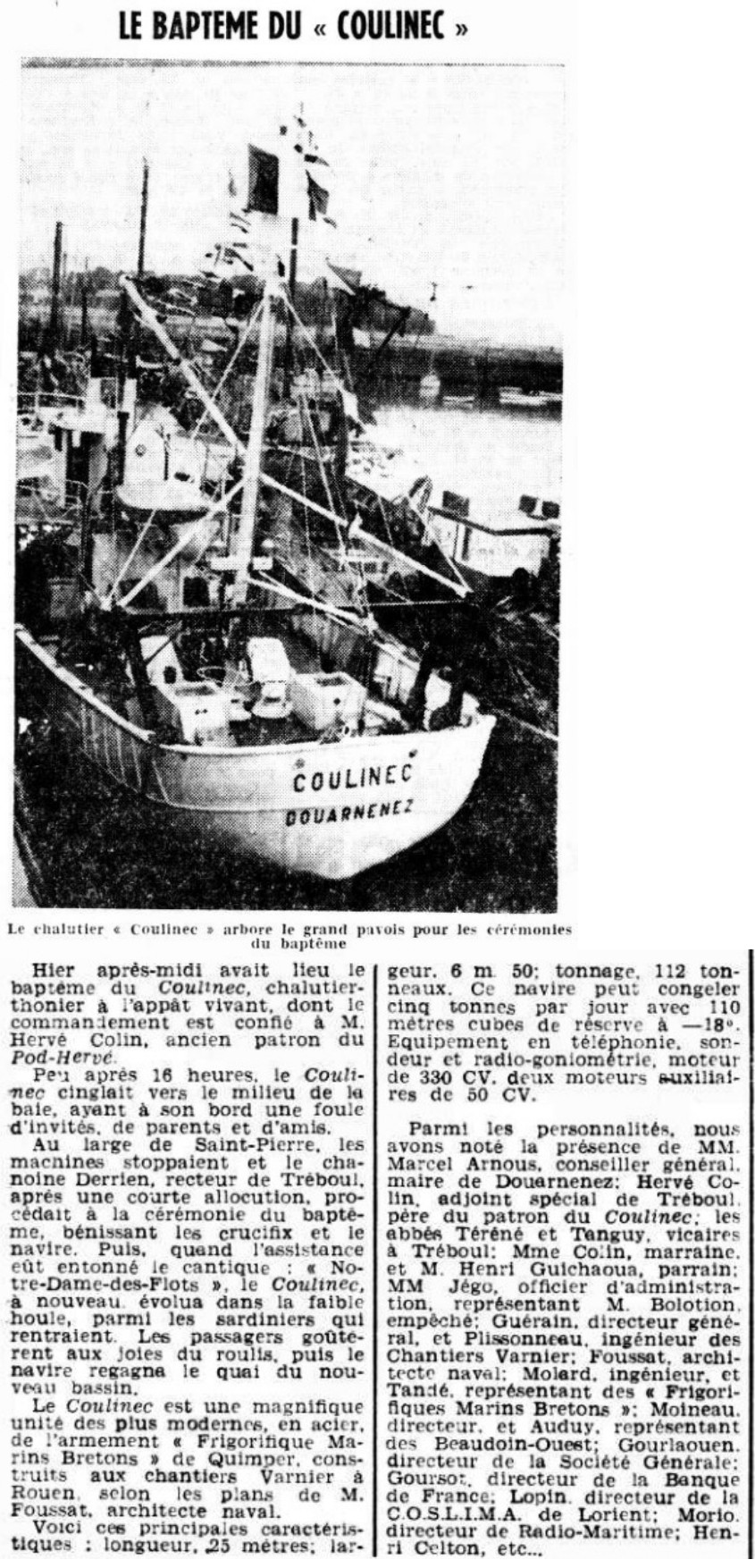 patron Hervé Colin, chanoine Derrien, architecte naval Foussat, MM. Marcel Arnous, Hervé Colin père, abbés Téréné et Tanguy, Mme Colin, Henri Guichaoua, Jégo, Bolopion, Guérain, Plissonneau, Molard, Tandé, Moineau, Auduy, Gourlaouen, Goursot, Lopin, Morio, Henri Celton