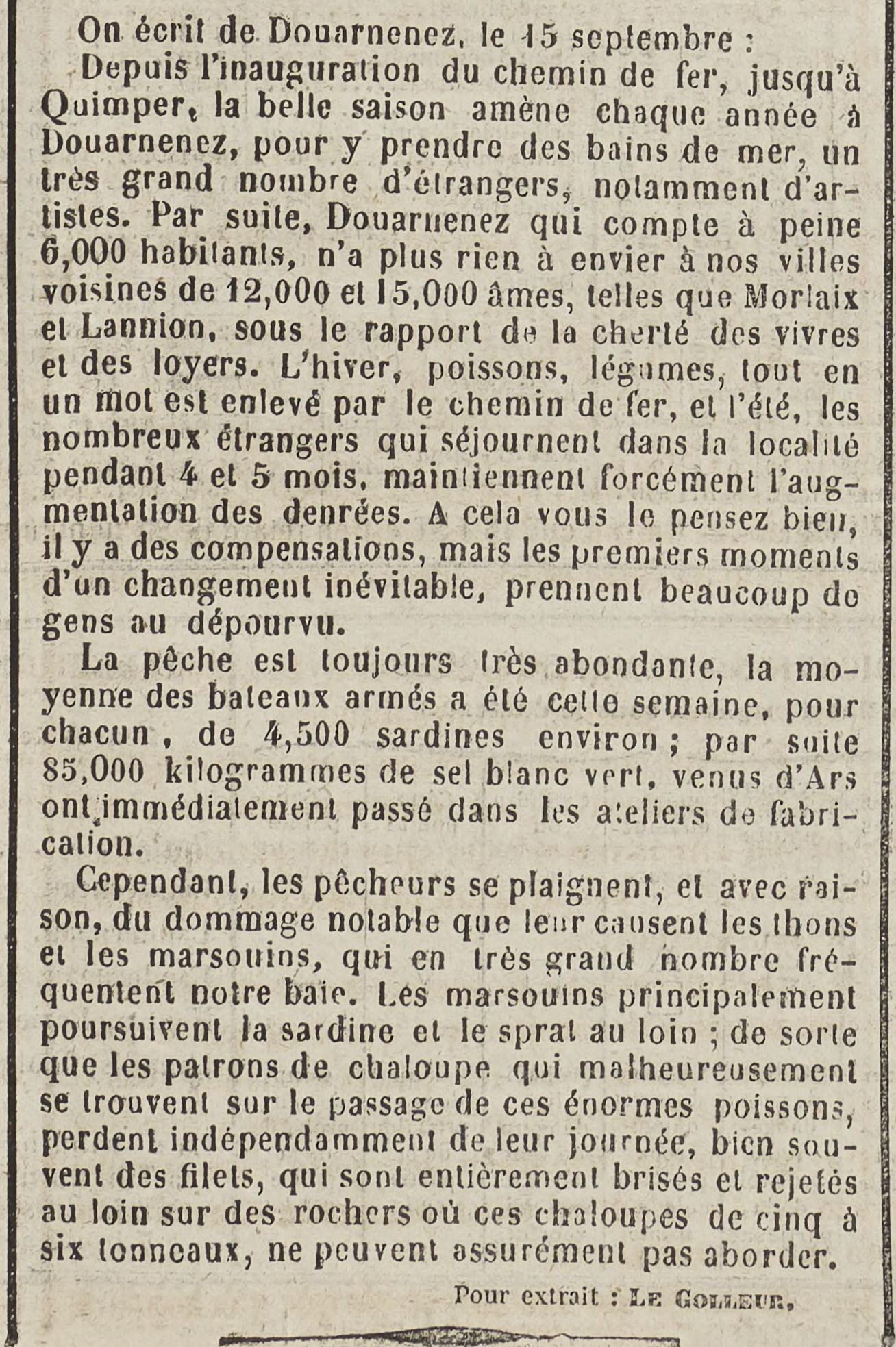 Journal L'Armoricain Date 19 September 1865 Mots-clés Inauguration, Chemin de fer, Étrangers, Baigneurs, Artistes, Saison balnéaire, Cherté, Vivres, Augmentation, Sardine, Pêche abondante, Sel, Pêcheurs, Plaintes, Dommages, Dégâts, Thons, Marsouins, Filets Lieu(x) Douarnenez, Quimper, Morlaix, Lannion, Ars-en-Ré, Baie de Douarnenez Personnes Le Golleur Contributeur(s) Jacques Join Image