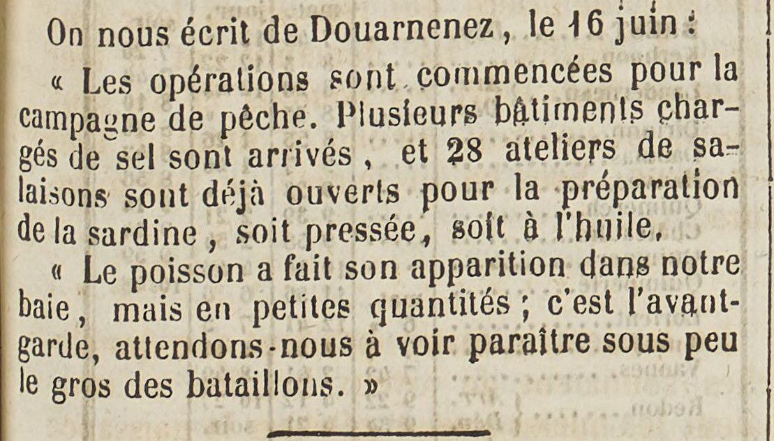 Journal L'Armoricain Date 17 June 1869 Mots-clés Préparatifs, Campagne de pêche, Sel, Salaison, Sardine à l'huile, Sardine pressée, Apparition, Sardine, Baie Lieu(x) Douarnenez, Baie de Douarnenez Contributeur(s) Jacques Join Image