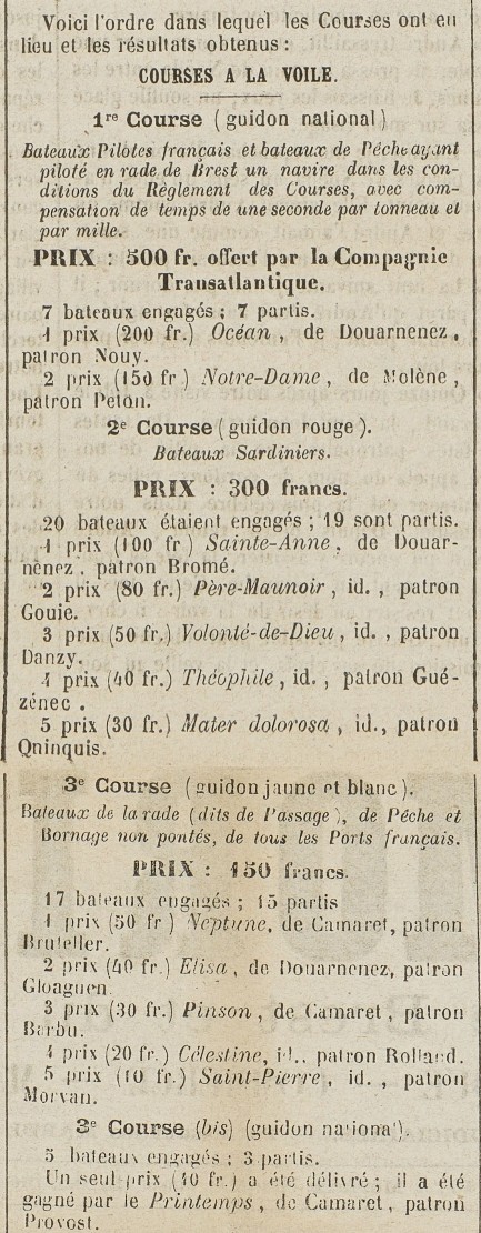 "Notre-Dame" (Molène), "Sainte-Anne" (DZ N° ?), "Neptune" (Camaret), "Pinson" (Camaret), "Célestine" (Camaret), "Saint-Pierre" (Camaret), "Printemps" (Camaret)