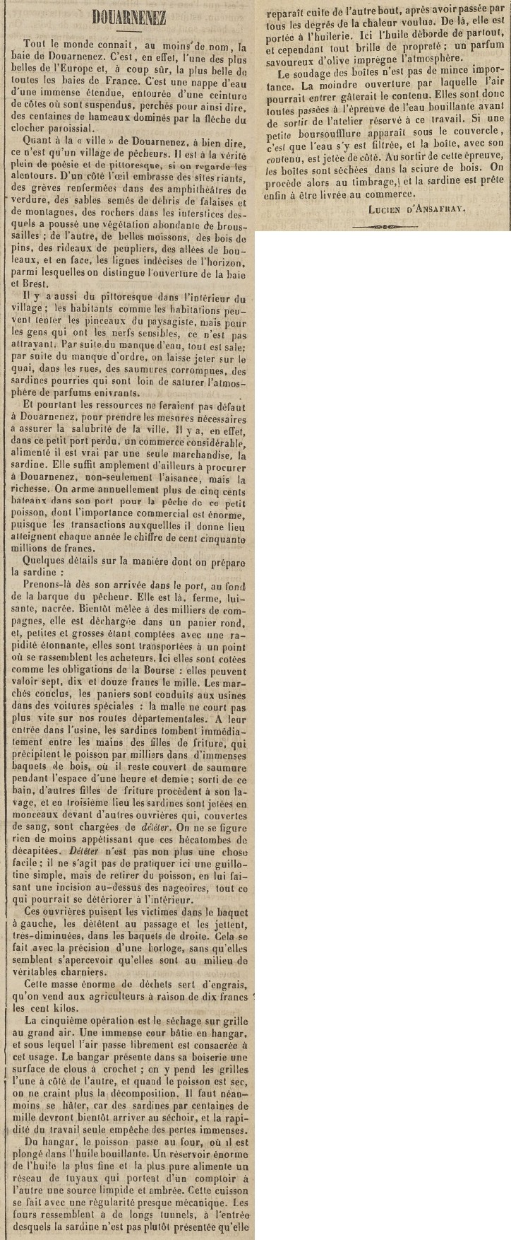 Journal Le Bas-Breton Date 04 November 1876 Mots-clés Ville, Baie, Description, Pêcheurs, Pittoresque, Poésie, Saleté, Salubrité, Commerce, Sardine, Préparation, Femmes de friture, Étêtage, Séchage, Cuisson, Huile d'olive, Soudage , Boîtes Lieu(x) Douarnenez, Baie de Douarnenez, Europe Personnes Lucien d'Ansafray Contributeur(s) Jacques Join Image