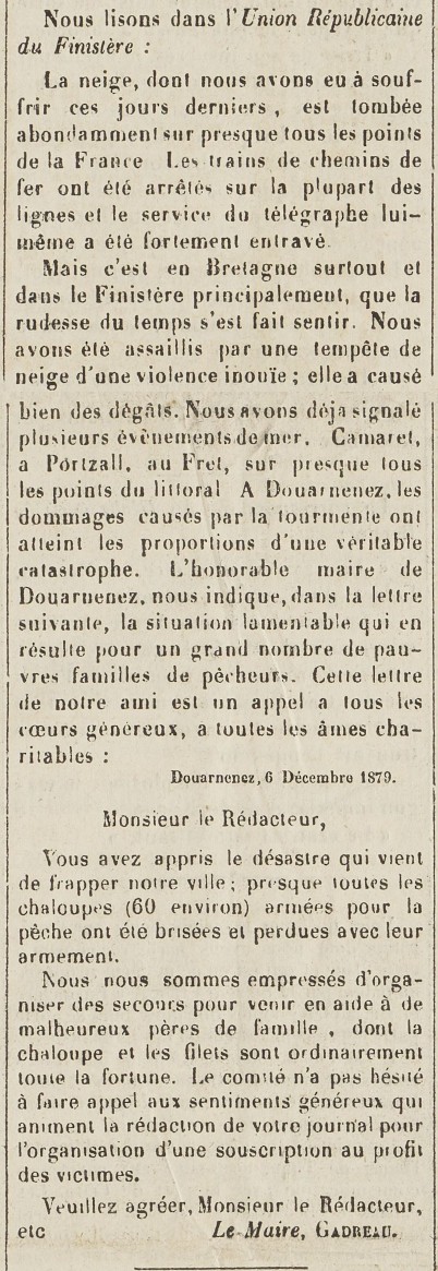 Journal Le Bas-Breton Date 13 December 1879 Mots-clés Neige, Abondance, Tempête, Violence, Dégâts, Événements de mer, Dommages, Tourmente, Catastrophe, Maire, Lettre, Appel, Générosité, Familles, Pêcheurs, Désastre, Chaloupes, Pertes, Filets, Secours, Aide, Souscription, Victimes Lieu(x) Finistère, Bretagne, France, Camaret, Portsall, Le Fret, Douarnenez Personnes M. Joseph Gadreau Contributeur(s) Jacques Join Image