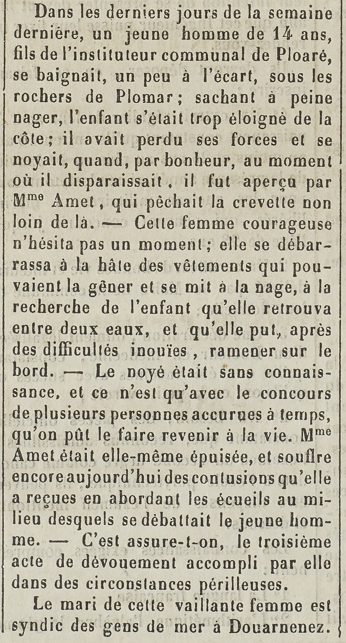 Journal Le Bas-Breton Date 30 June 1883 Mots-clés Jeune, Baignade, Danger, Noyade, Sauvetage, Réanimation, Contusions, Rochers, Courage, Dévouement, Syndic des gens de mer Lieu(x) Ploaré, Plomarc'h, Douarnenez Personnes Mme Amet Contributeur(s) Jacques Join Image