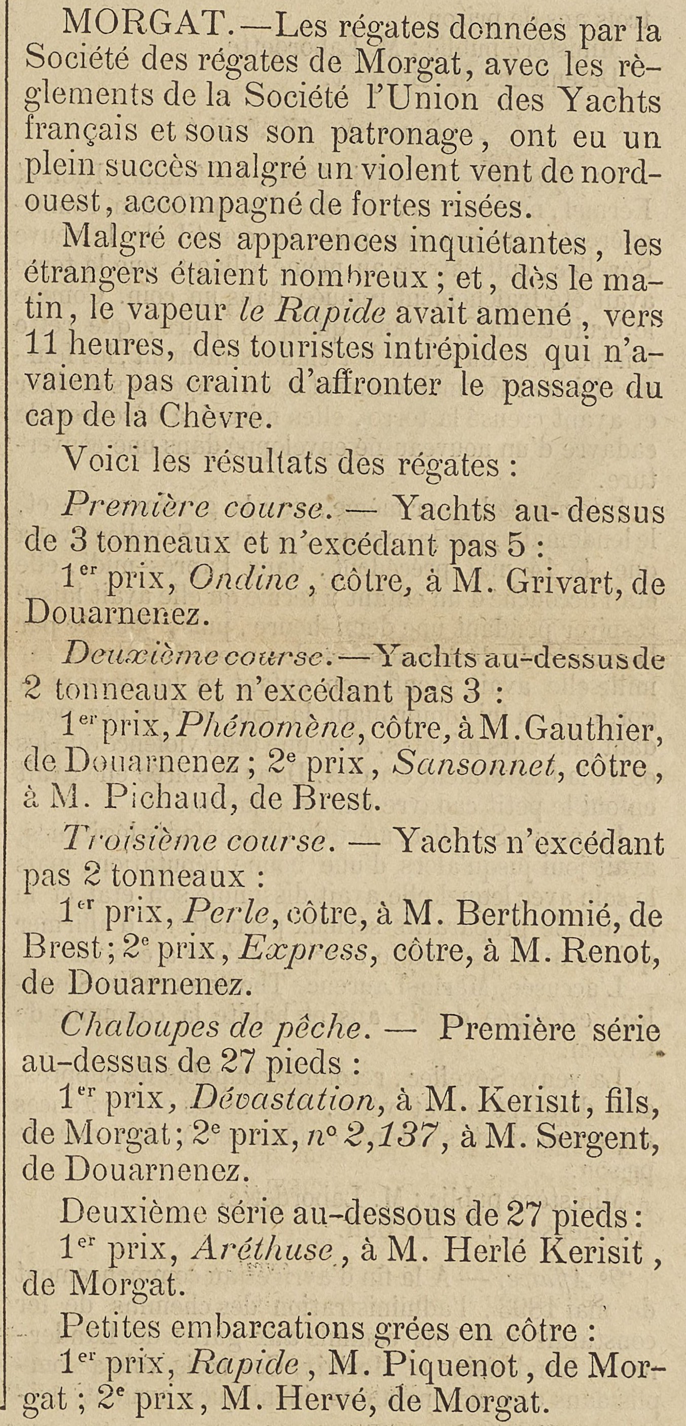 vapeur le "Rapide", cotres "Ondine", "Phénomène", "Sansonnet", "Perle", "Express", "Rapide", chaloupes "Dévastation" (Morgat), "Aréthuse" (Morgat)