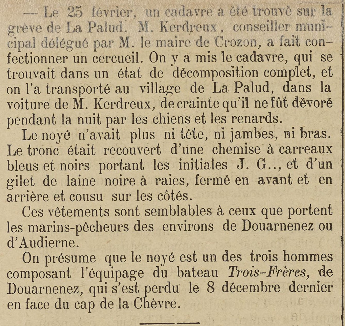 Journal Le Bas-Breton Date 10 March 1894 Bateau(x) QUATRE FRERES - ADZ2362 Canot - 1893-1893 Mots-clés Découverte, Cadavre, Grève, Conseiller municipal, Cercueil, Noyé, Vêtements, Naufrage, Chaloupe Lieu(x) Crozon, La Palud, Douarnenez, Audierne, Cap de la Chèvre Personnes M. Kerdreux Contributeur(s) Jacques Join Image