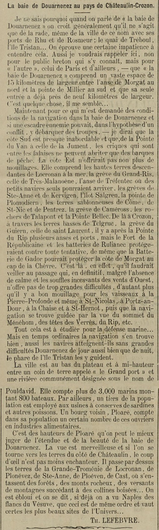 Baie de Douarnenez, Châteaulin, Crozon, Port-Rhu, Rosmeur, Tréboul, Île Tristan, Paris, Morgat, Pointe du Millier, Pointe du Van, Pointe de la Jument, Locronan, Le Ris, Trezmalaouen, Tréfeuntec, Sainte-Anne-la-Palud, Anse de Kervigen, Îlot Salgren, Plomodiern, Saint-Nic, Pentrez, Grève de Caméros, Pointe du Bellec, Telgruc, Batterie de Rulianec, Batterie du Kador, Cap de la Chèvre, La Pierre Profonde, Saint-Nicolas, Porz an Dour, Pointe de Saint-Hernot, Ménez-Hom, Les Verres, Grand Port, Pouldavid, Ploaré, Plonévez-Porzay, Cast, Naples, Vésuve