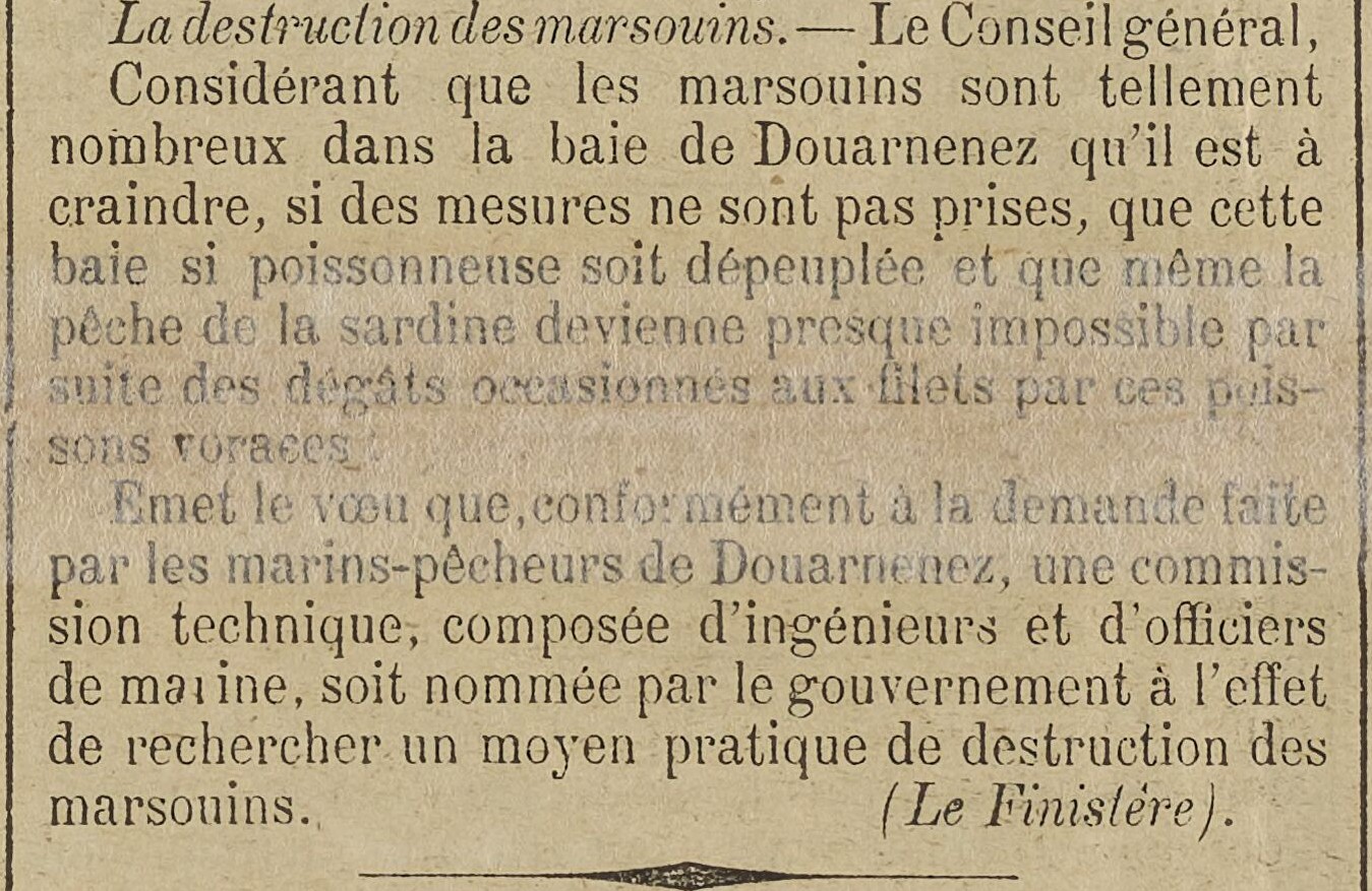 Journal Le Bas-Breton Date 21 September 1901 Mots-clés Conseil général, Vœux, Destruction, Marsouins, Baie, Pêche à la sardine, Dégâts, Filets, Commission, Gouvernement, Recherche, Mesures Lieu(x) Douarnenez, Baie de Douarnenez Contributeur(s) Jacques Join Image