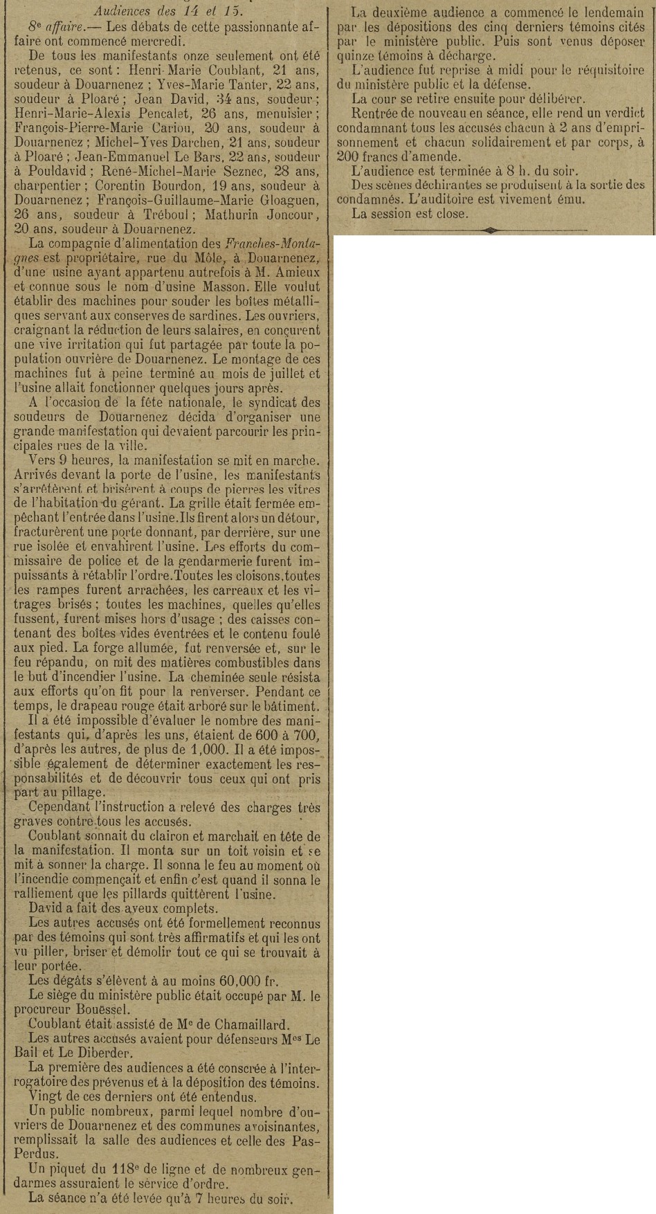 Henri-Marie Coublant, Yves-Marie Tanter, Jean David, Henri-Marie-Alexis Pencalet, François-Pierre-Marie Cariou, Michel-Yves Darchen, Jean-Emmanuel Le Bars, René-Michel-Marie Seznec, Corentin Bourdon, François-Guillaume-Marie Gloaguen, Mathurin Joncour, M. Amieux, usine Masson, procureur Bouëssel, Mes de Chamaillard, Le Bail et Le Diberder