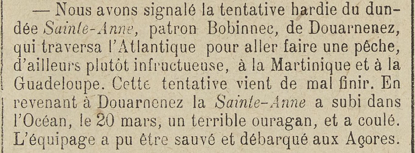 Journal Le Bas-Breton Date 15 April 1911 Bateau(x) SAINTE ANNE - DZ1697 Dundee mauritanien - 1910-1911 Mots-clés Dundée, Langoustier, Traversée, Tentative, Ouragan, Naufrage, Équipage sauvé Lieu(x) Douarnenez, Atlantique, Martinique, Guadeloupe, Açores Personnes patron Auguste Bobinec Contributeur(s) Jacques Join Image