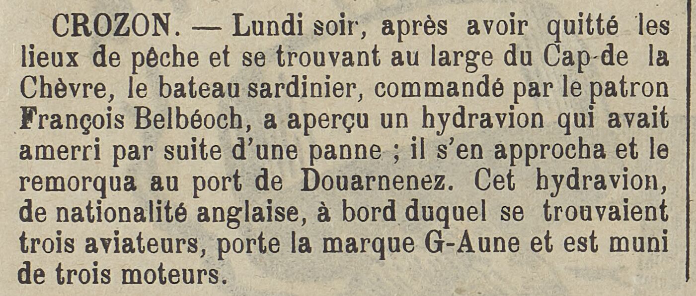 Journal Le Bas-Breton Date 12 November 1932 Bateau(x) DUMONT D'URVILLE - DZ2774 Canot ponte mixte - 1926-1936 Mots-clés Sardinier, Hydravion, Anglais, Panne, Remorquage, Marque, Moteurs Lieu(x) Crozon, Cap de la Chèvre, Douarnenez Personnes patron François Belbéoch Contributeur(s) Jacques Join Image